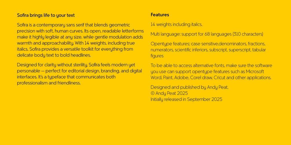 Designed for clarity without sterility, Sofira feels modern yet personable — perfect for editorial design, branding, and digital interfaces. It’s a typeface that communicates both professionalism and friendliness.